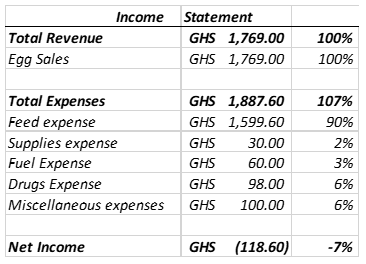 From the table above, total revenues for February was GH₵ 1,769.00. Furthermore, operating expenses for February totalled GH₵ 1,887.60 representing 107% of the total revenue. The highest operating expense for the period was feed expense which was GH₵ 1,599.60 representing 90% of the total revenue. From the income statement, it can be concluded that the business recorded a net loss of GH₵ 118.60 representing -7% of the total revenue.