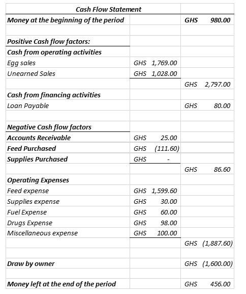 The cash flow statement is very important because it gives you a clear description of how much money is entering and leaving your business. For instance, if you want rear layers and make proper cash flow projections, you will realize that it takes layers at least 4 months before they lay any eggs – this means you must understand that cash will be flowing out of your business without any return for approximately four months. Having this knowledge will help you understand the amount of money you need to raise to run your business.