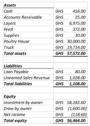 From the balance sheet above, the ratio of liabilities to owner’s equity for the period was 0.02 which shows that the business is in a very healthy financial position and can easily pay its debts. Liabilities of the business comprise loan payable: GH₵ 80.00 and unearned sales revenue (advance purchases by customers): GH₵ 1,028.00. During the period under review, Papa K. Owusu-Mensah, owner of the business, took out GH₵1,600.00 cash for personal use leaving him with an ending equity of GH₵ 56,464.00.