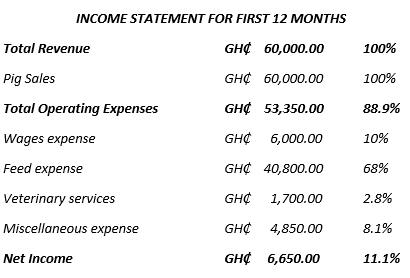 Pigs are sold per the weight of their meat. A pound of pork costs about GH₵12.00 and since 2.2 pounds will make a kilo, a kilo of pork will cost slightly above GH₵25.00. A mature pig weighs about 60 kilos so its market price will be about GH₵1,500.00. Selling the 40 pigs will give us a total revenue of GH₵60,000.00. The profit is, therefore, GH₵6,650.00 which is 11.08% of the total revenue.